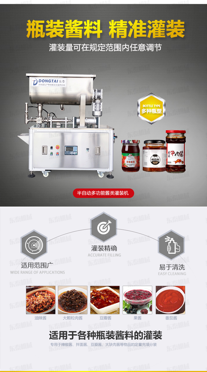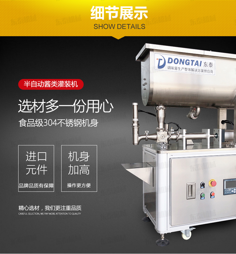 半自動灌裝機械,配置的自動攪拌器,保證了醬和油的充分混合,可灌裝顆粒漿狀流體物料在對辣椒醬、拌面醬、豆鼓等醬類進行灌裝時,灌裝量可在規定范圍內任意調節,計量誤差小,該半自動醬類灌裝機采用壓縮空氣為動力可在各種環境中使用。