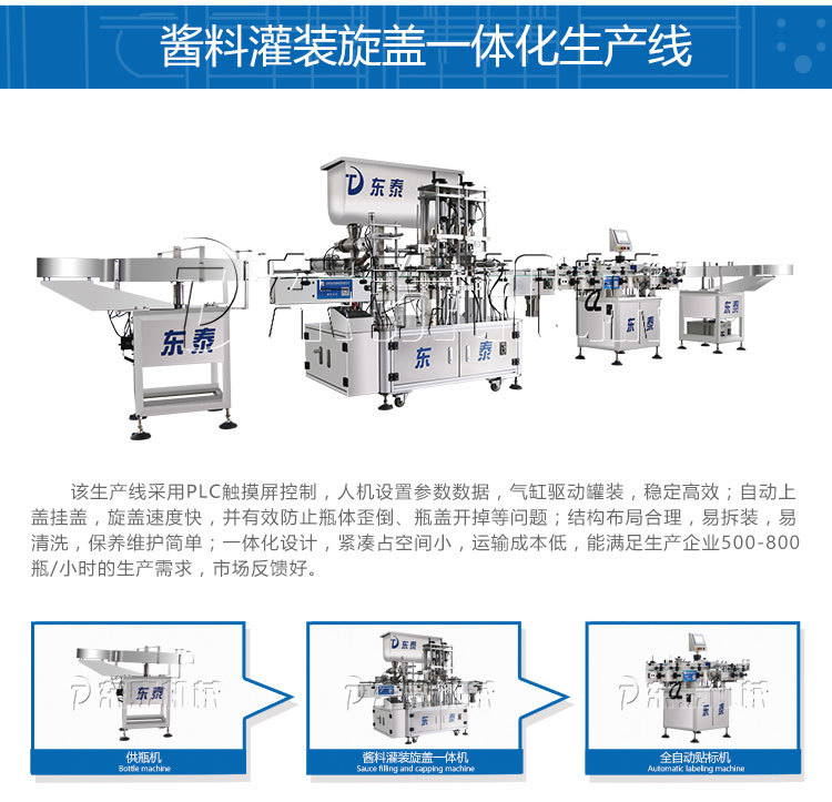 作為國(guó)內(nèi)專業(yè)的醬料灌裝機(jī)廠家,我們東泰機(jī)械能夠在市場(chǎng)中不斷實(shí)現(xiàn)創(chuàng)新和突破,是我們結(jié)合了市場(chǎng)的真實(shí)情況以及客戶的真實(shí)需求來(lái)不斷跟隨市場(chǎng)的需求和需要進(jìn)行變化,從而掌握市場(chǎng)的主動(dòng)權(quán),才致使醬料灌裝機(jī)朝著高端化、智能化的方向前行,來(lái)得到更多消費(fèi)者的好評(píng)和認(rèn)可,辣椒醬再我們生活之中已經(jīng)是屬于再熟悉不過(guò)的產(chǎn)品了,雖說(shuō)醬料的好處比較多,也可以提高食物的口味,但是你可能不知道的是,味道好的醬料也是離不開包裝,既然有了包裝的需求自然離不開醬料灌裝機(jī)。